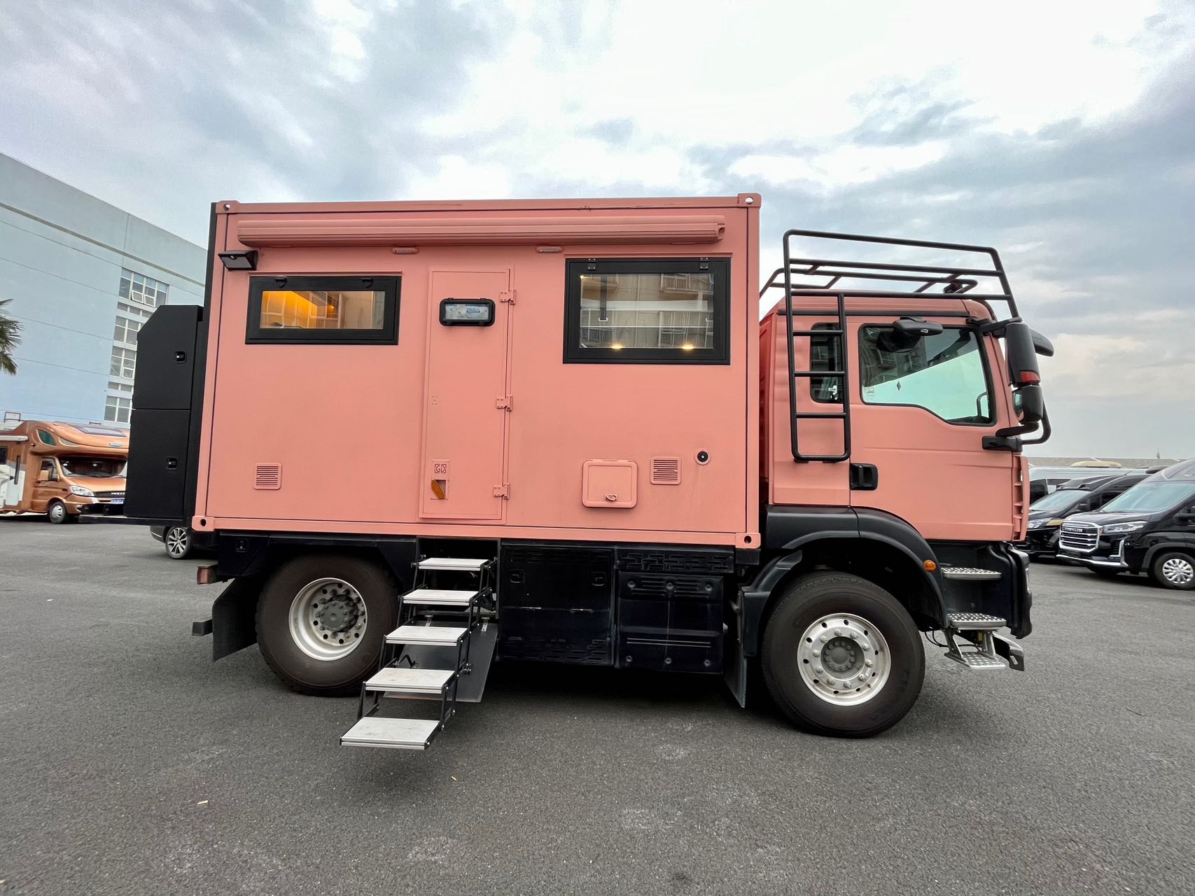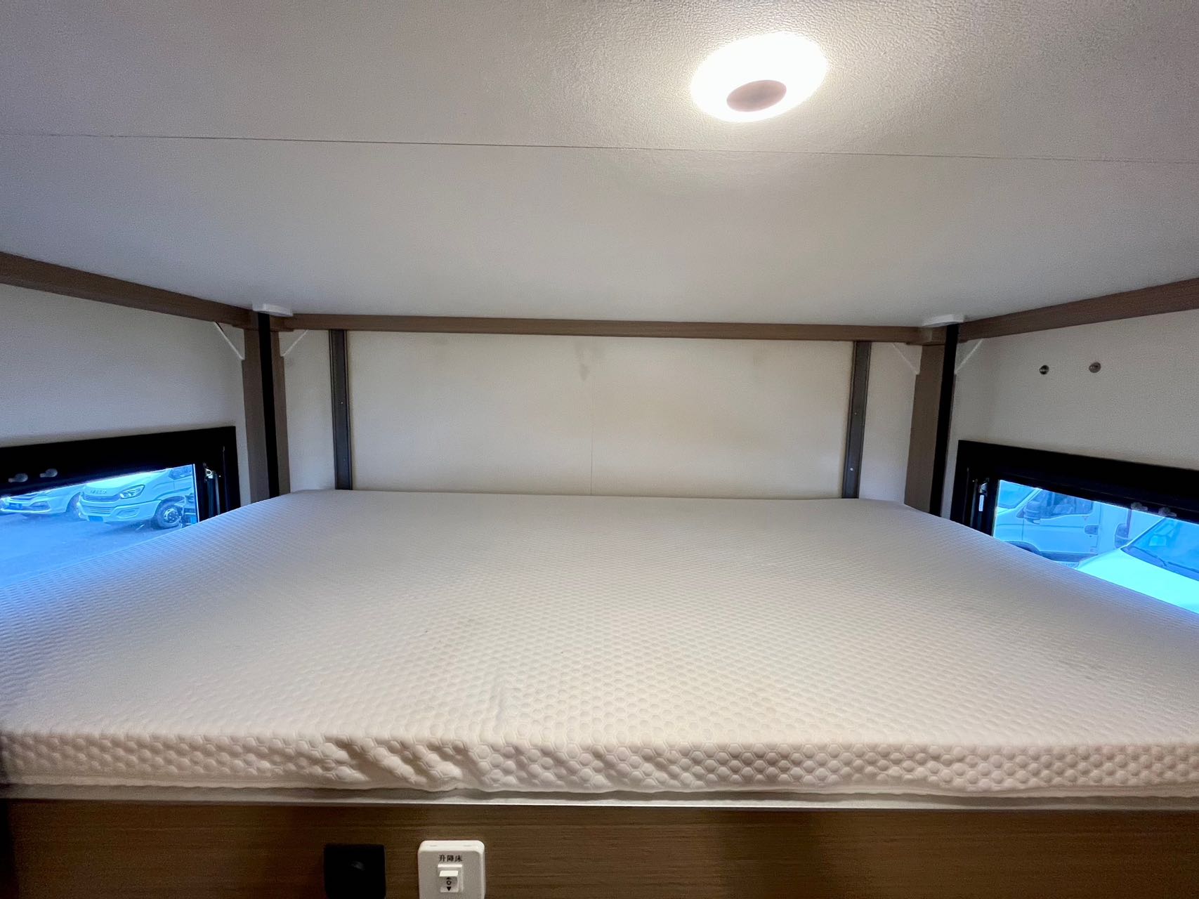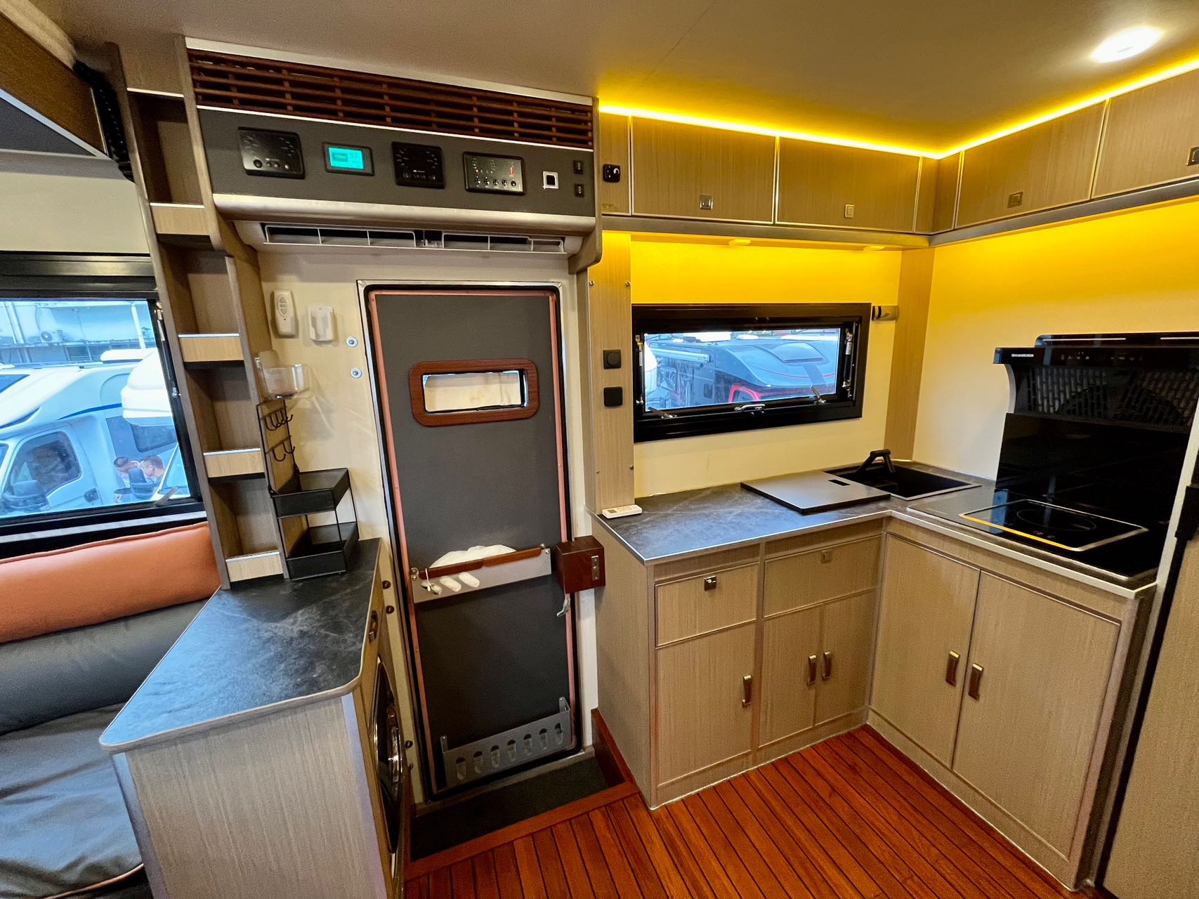 【戶外配置】:220V市電接口,重力加水口,電動戶外遮陽棚,中門密碼鎖,五階上車踏步,電動升降儲物箱和摩托車架,車頂射燈