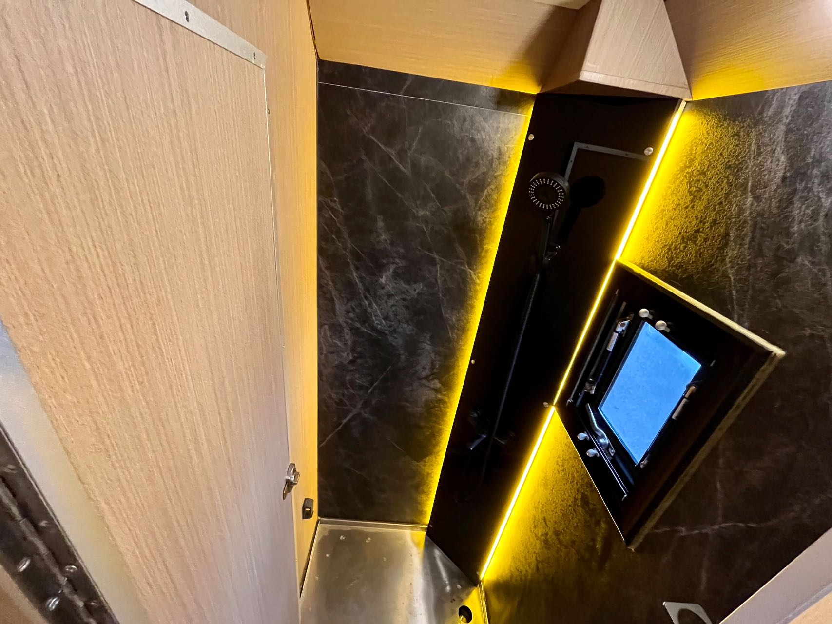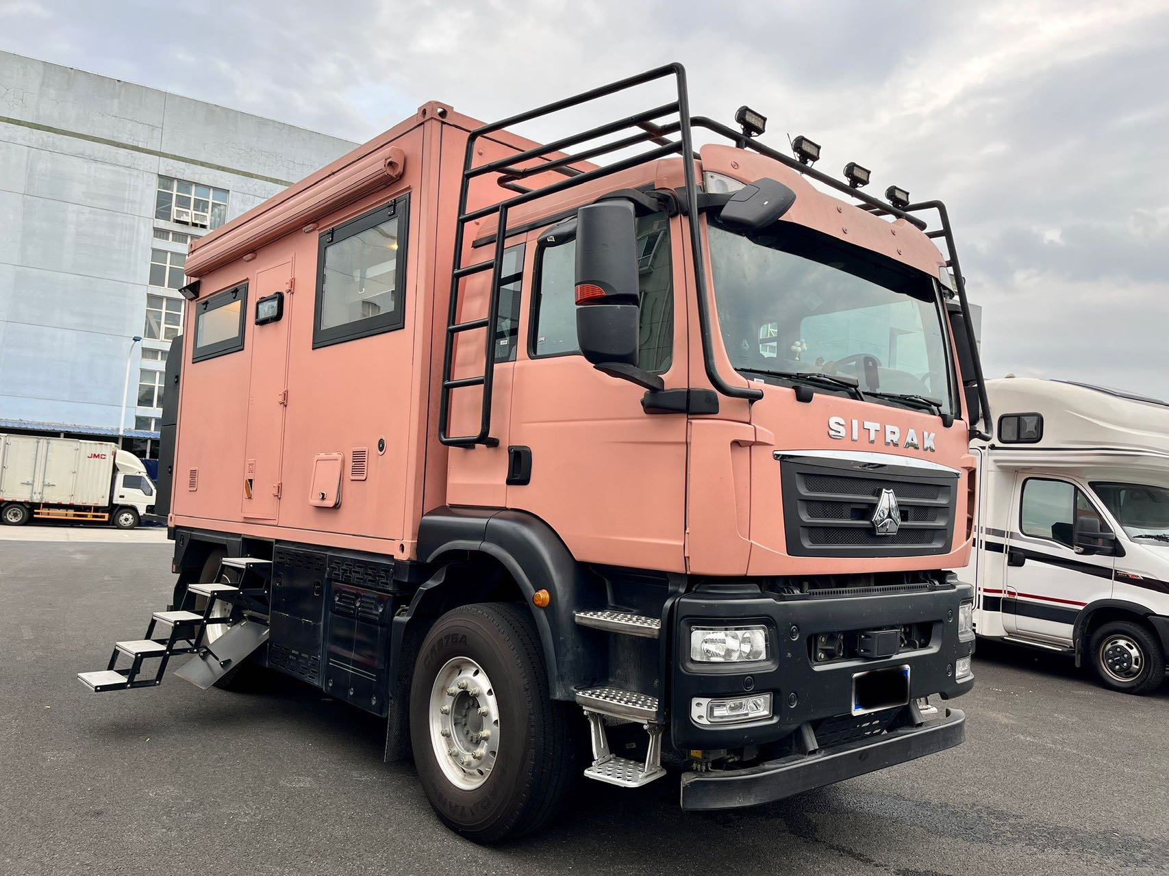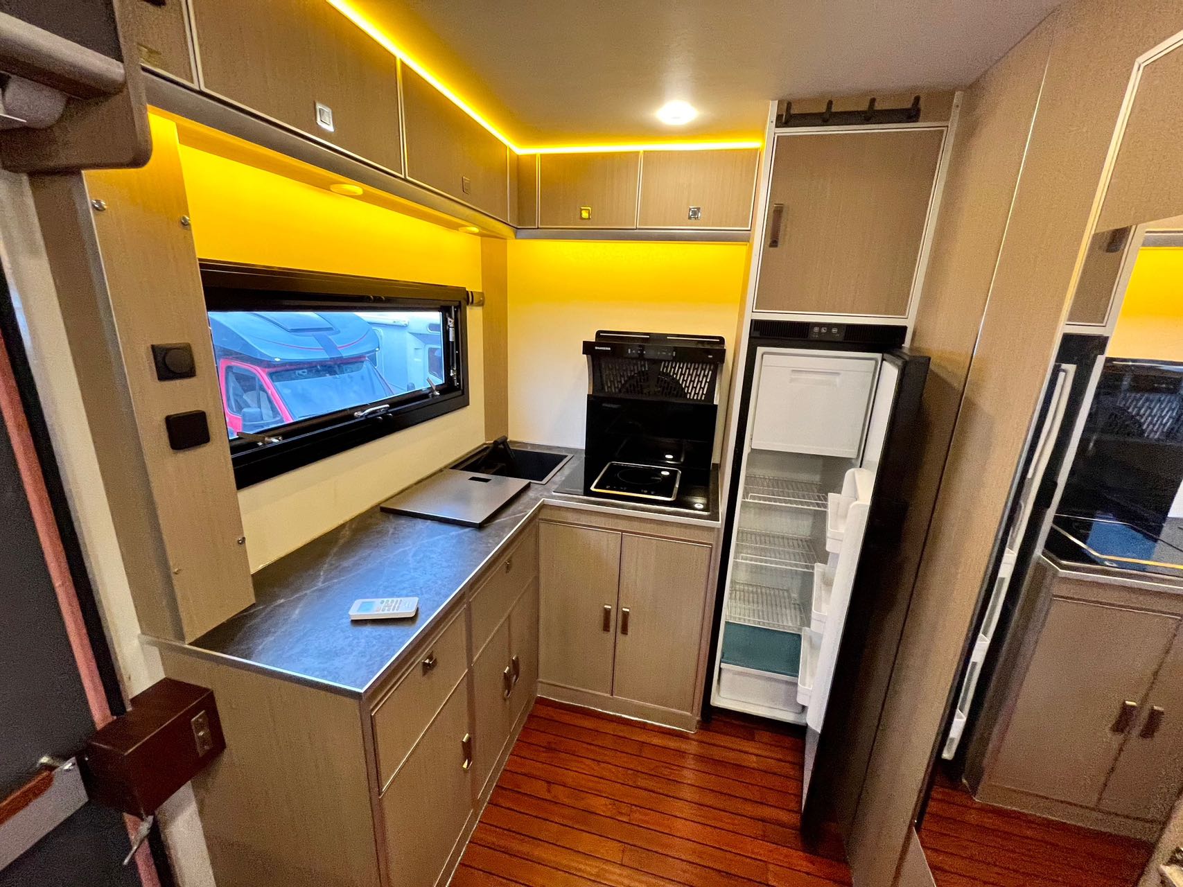 【戶外配置】:220V市電接口,重力加水口,電動戶外遮陽棚,中門密碼鎖,五階上車踏步,電動升降儲物箱和摩托車架,車頂射燈