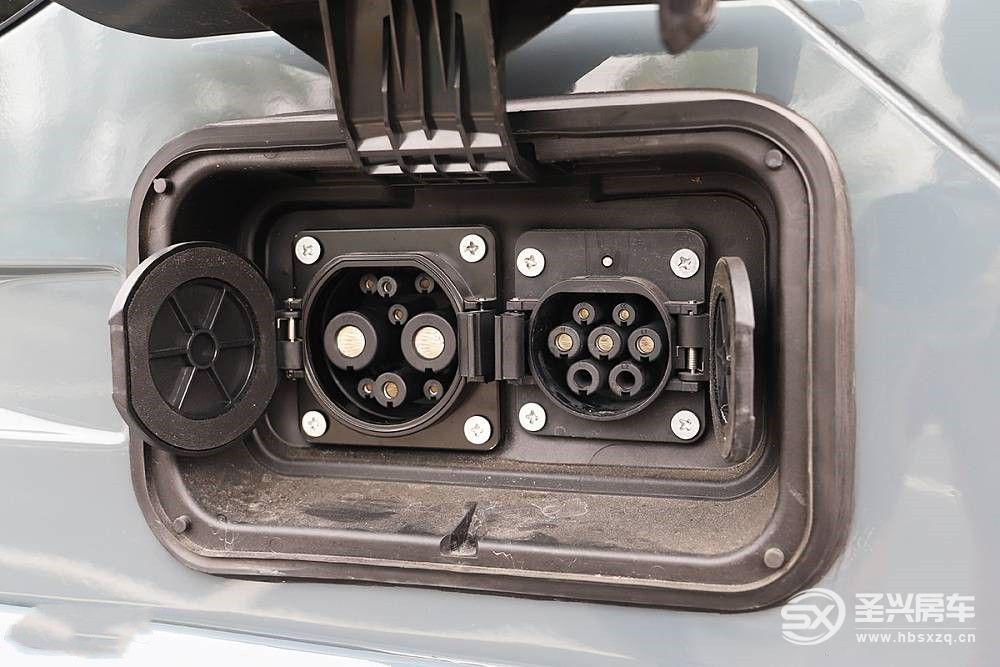 為保持車身整體性,福客特征服者并沒有配備過多車外配置,我們僅在車尾找到了注水口和市電接口,值得一提的是福客特征服者充電接口支持快、慢充形式,和新能源乘用車一樣,無論是城市充電樁還是家用充電線都可以為鋰電池充電。