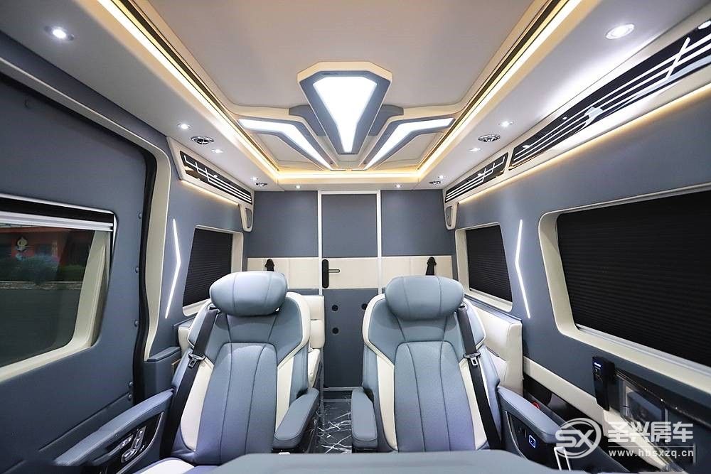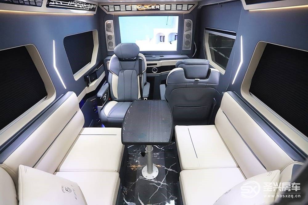會客區(qū)為環(huán)繞式沙發(fā)+升降桌布局,整個區(qū)域駐車時可乘坐多人,但行駛中會客區(qū)僅能乘坐2人,加上駕駛室、航空座椅區(qū)域,最終整臺車核載人數(shù)為6人,最后排正向單獨座椅需要收納進去才能打開衛(wèi)浴間門。