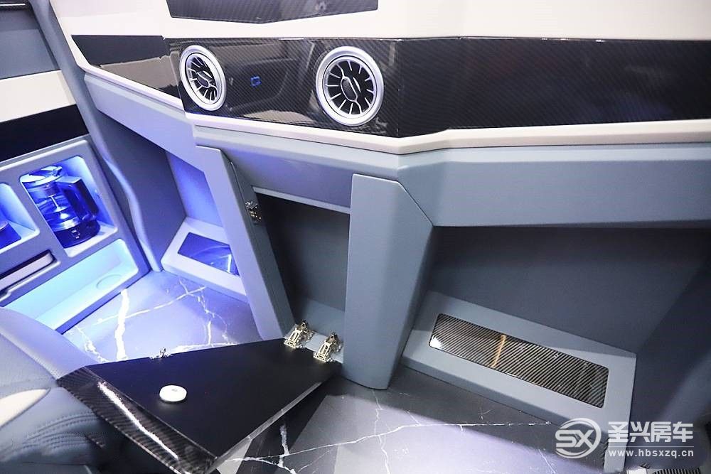 駕駛室部分進行了全方位的皮質(zhì)軟包和碳纖維水轉(zhuǎn)印飾板裝飾,看上去豪華舒適同時與生活區(qū)風(fēng)格統(tǒng)一。