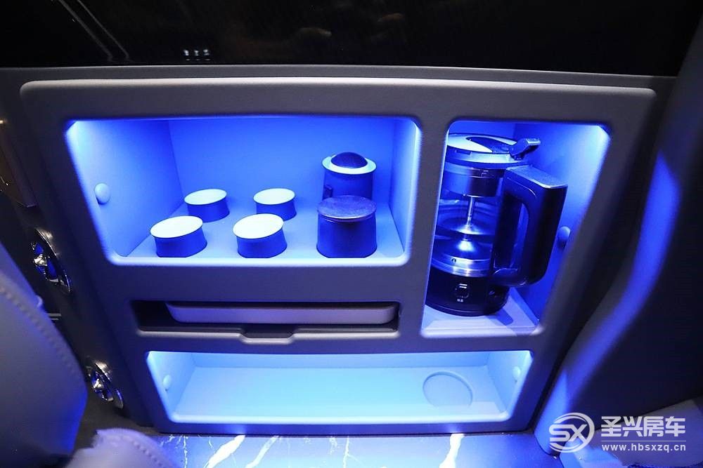 在左側(cè)商務(wù)座椅旁邊配有完整的茶具,內(nèi)部嵌入藍(lán)色氛圍燈,與客人交談時,喝茶、品茶更能拉近用戶與客戶之間的距離。