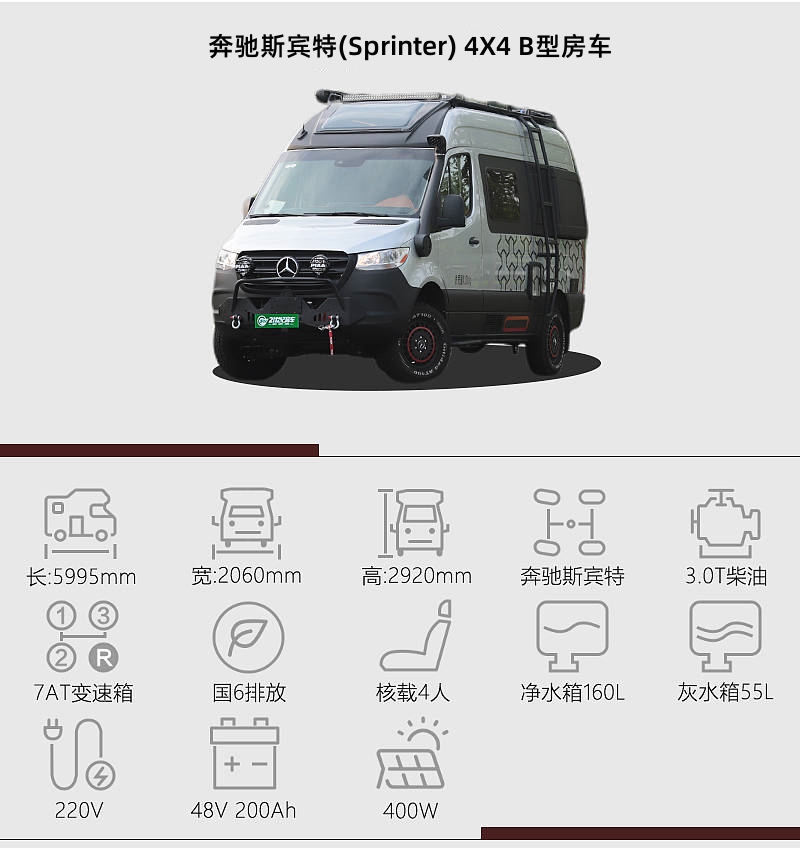 奔馳斯賓特(Sprinter)整備質(zhì)量3650kg,動力上搭載3.0T柴油發(fā)動機,滿足國六排放標準,最大功率191馬力,峰值扭矩440牛·米,與其匹配的是7擋自動變速箱。另外,新車搭載了一套全時四驅(qū)系統(tǒng),并帶有中央差速鎖,提升了車輛的脫困能力。