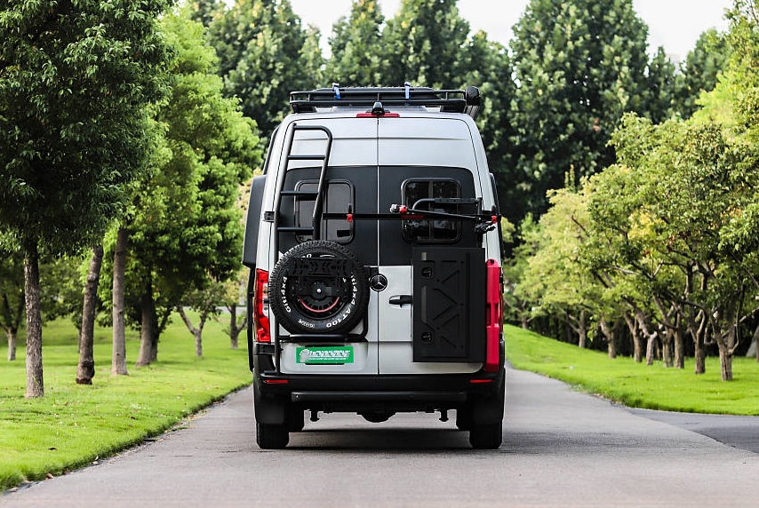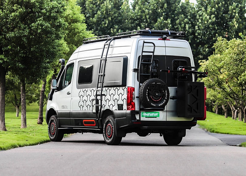 車尾配置包括爬梯、全尺寸備胎、自行車架、儲物艙等。底部配有三口拖車杠。車頂位置裝配了頂置行李架,用戶可以從車側(cè)、車尾爬梯夠取行李物品。