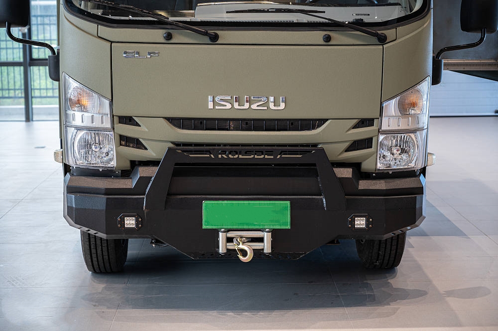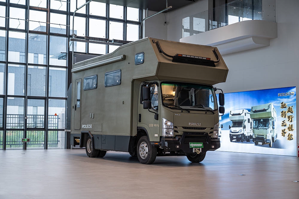 五十鈴700P房車大量使用標(biāo)志性的硬派越野元素和棱角分明的方形線條設(shè)計(jì),全車噴涂軍綠色中顆粒防爆漆給人一種堅(jiān)固耐用的直觀感受,方正的車身輪廓也更適合提供更多的空間和載重能力。