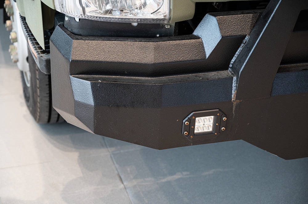 車頭部分配有遠(yuǎn)近光大燈、霧燈和額頭處越野LED探照燈,探照大燈是一種特殊的燈光裝置可向前方發(fā)出高強(qiáng)度遠(yuǎn)射光線,照亮前方的道路和環(huán)境增加駕駛的安全性,在野外或者霧霾天氣等低視野條件下,提供足夠的照明,讓駕駛者能夠清楚地看到前方的路況和障礙物,避免發(fā)生碰撞和事故。