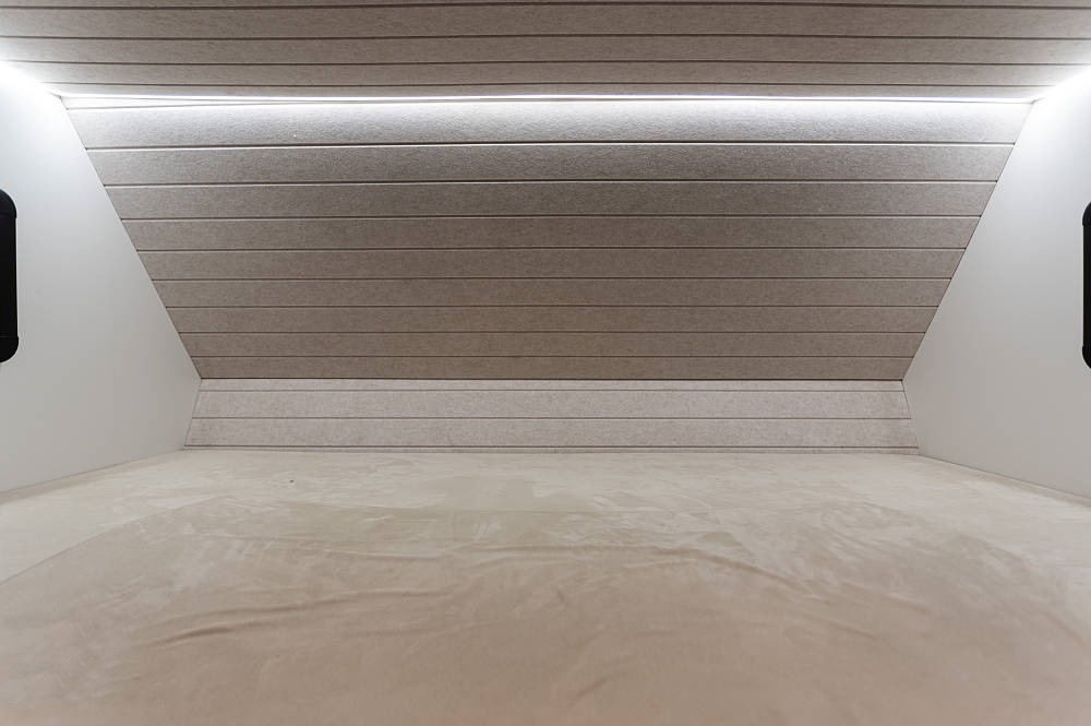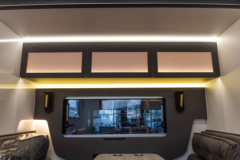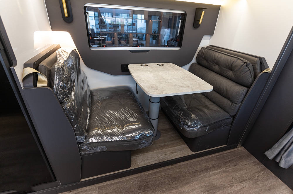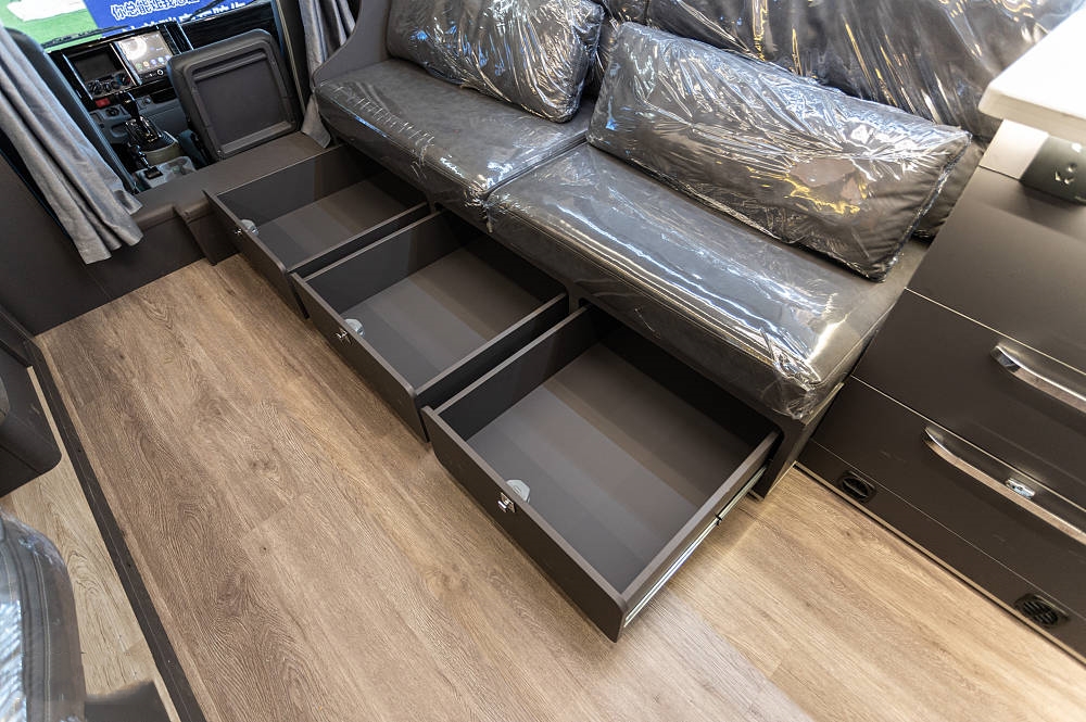 會客區(qū)的側(cè)拓展區(qū)域放置了深灰色對卡座沙發(fā),方便在此用餐、辦公等,相比競品車型,五十鈴700P的對卡座沙發(fā)在橫、縱向空間優(yōu)勢明顯,在坐墊長度、厚度以及邊緣腿部承托力方面都進(jìn)行了全面強(qiáng)化。中間為一張氣動升降餐桌可四向平移,設(shè)有杯槽,操作便捷。將升降桌降下后可以與對卡座拼成一張臨時(shí)床鋪睡臥使用。座椅上方有三段式儲物格,方便隨時(shí)起身拿取隨身物品。車廂燈光采用當(dāng)下流行的無主燈照明系統(tǒng),懸浮式氛圍燈光,光線均勻,明暗和諧,使得車內(nèi)空間更有層次感。
