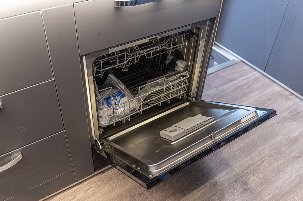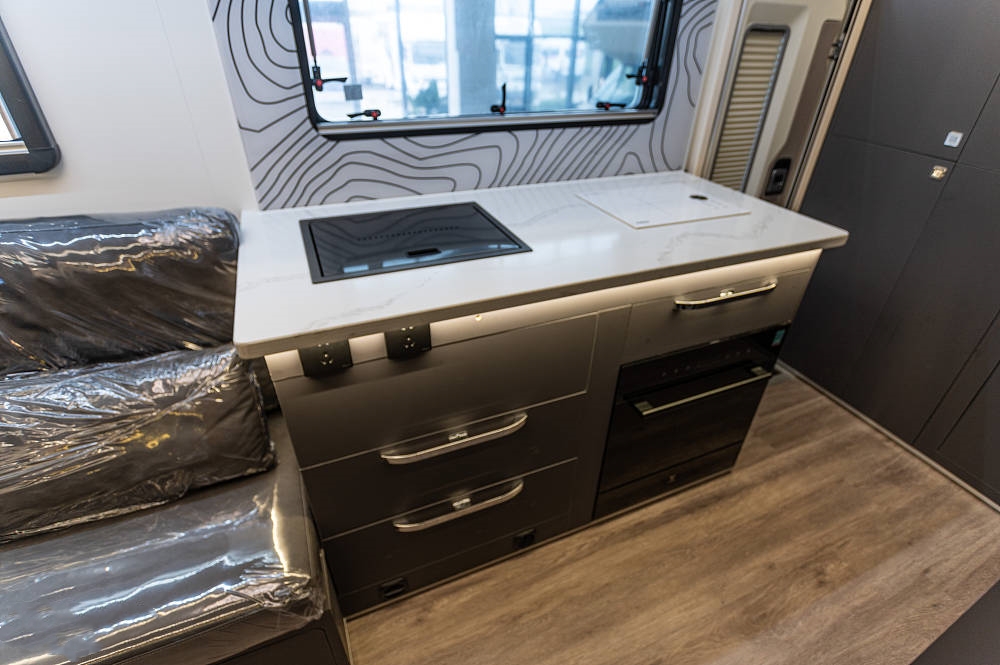 來到車廂中后部就是功能完備的廚房區(qū),白色石英石定制臺面之上配備了內(nèi)嵌式電陶爐、不銹鋼折疊式洗菜池,灶臺下方為多個(gè)廚具儲物抽屜、2個(gè)標(biāo)準(zhǔn)電源插板和洗碗機(jī),上方為一組三段式儲物吊柜。