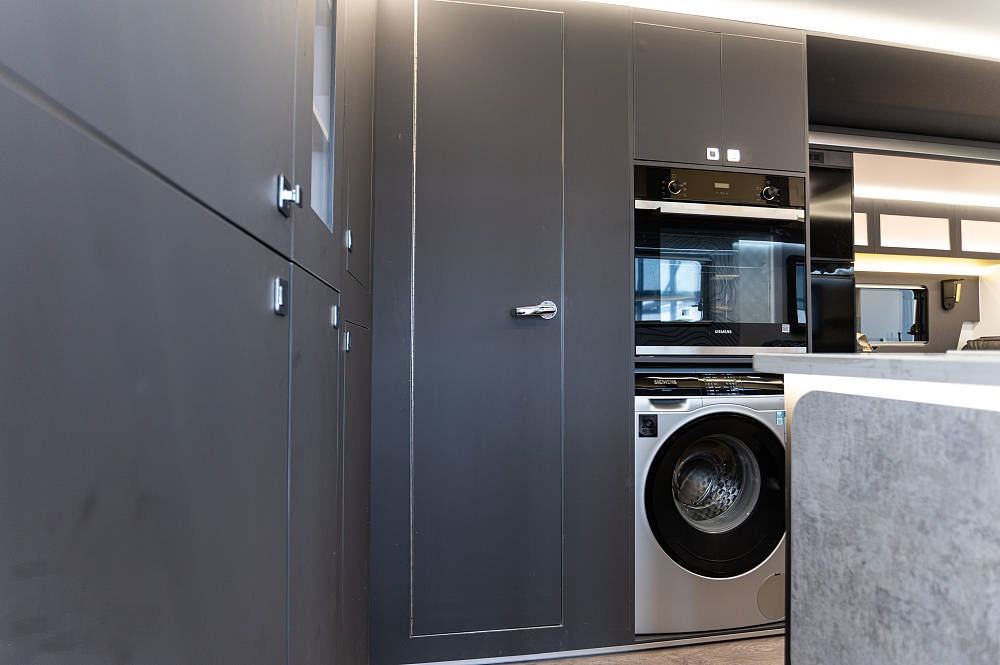 后方高柜之中內(nèi)嵌有西門子蒸烤箱,西門子滾筒洗衣機(jī),224L超大容量雙開門冰箱,食物儲存無煩惱。也是得益于超大的內(nèi)部尺寸,才可以在廚房布局上從容不迫,各種出點(diǎn)配置應(yīng)有盡有。