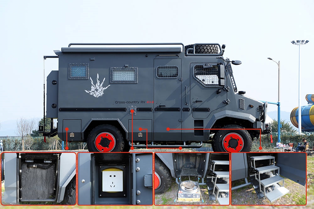 車身右側配有電動風感遮陽棚、保溫水箱、帶蓋式戶外電源插座、外置抽拉柴油灶、四級鋁合金踏步;對于如此龐大的身軀,左右兩側一些死角和盲區可以通過鋼架式對稱手動桿式倒車鏡、補盲鏡、前下視鏡來實現。其次,后擋風玻璃可以選裝鋼化材質,對于野外的安全性會得到明顯提升;另外,最小離地間隙360mm,接近角40°/離去角33°等特點也讓日常通過性得到了進一步的提升,放大了自身越野性的特征,對于雨林穿越飛沙走石可以說來者不拒。