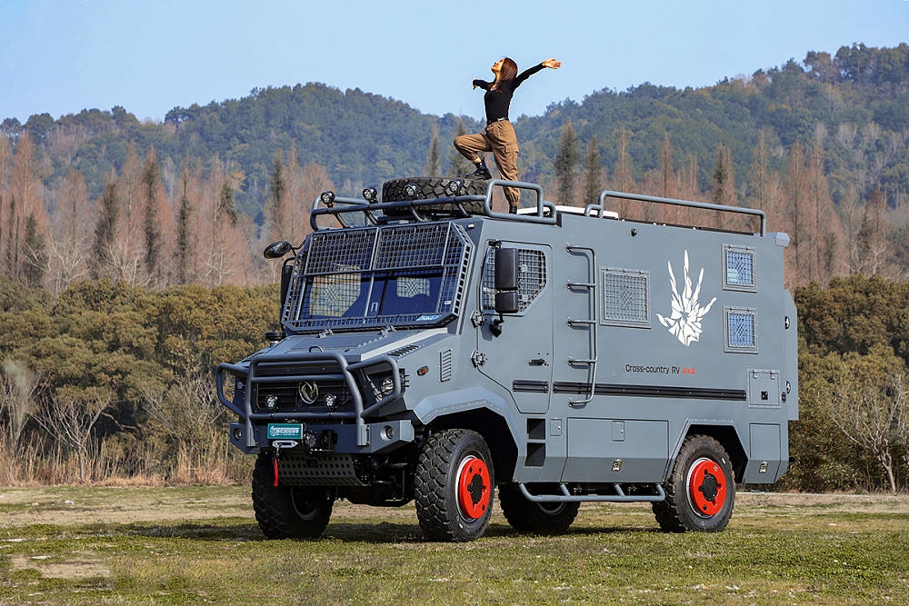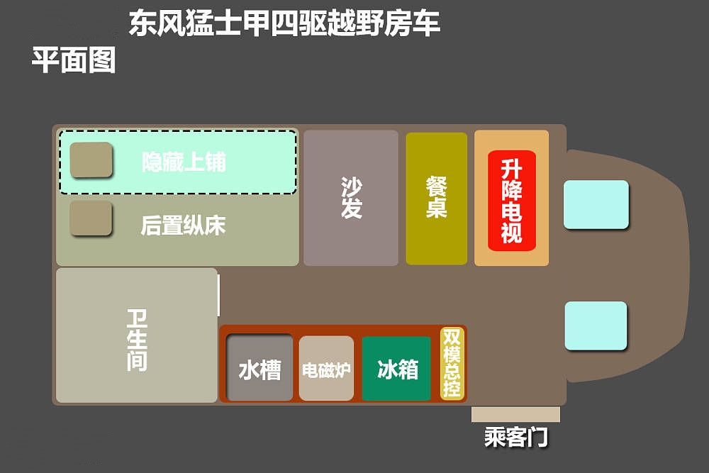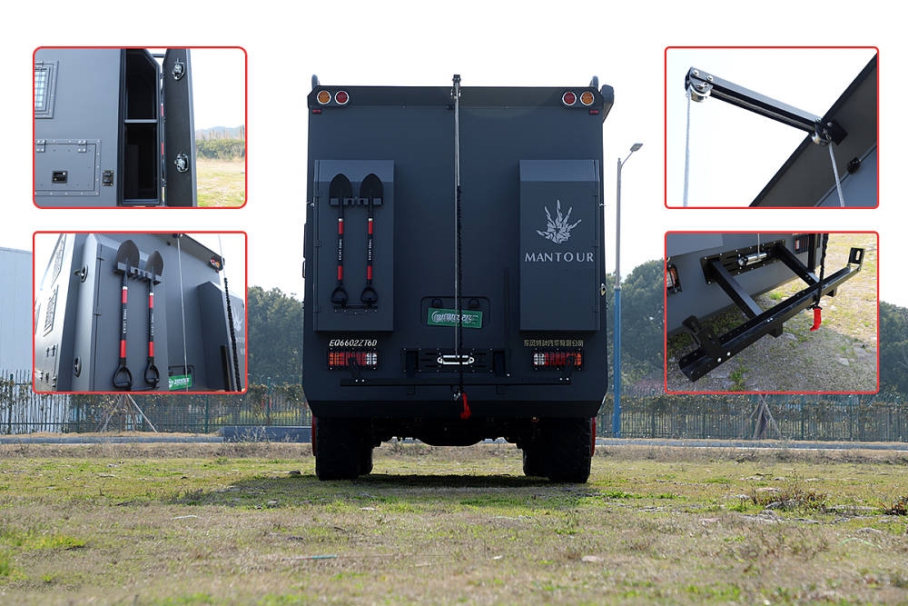 外觀涂裝方面,大膽采用機甲灰配色,還可定制顏色,加之硬朗造型,給了男人更想駕馭它的沖動!說到底盤、廂體結構和材質都大有來頭,整車電泳全鋼骨架+2.5mm厚的蒙皮鋼板結構;其中,全車電泳不易生銹;行業術語就是骨架蒙皮非承載式全鋼車身結構。東風猛士底盤配上軍用越野車專用車架,突出硬度高,抗扭性強的特點!另外,長鼻頭設計也有別于其它重卡車型,具有緩沖行程,有效保護駕駛員和乘員的人身安全。其實不管近看還是遠看,東風猛士甲四驅越野房車更像是一臺裝甲車,粗礦的線條,方正的輪廓,分明的菱角無不訴說其高大威猛的形象和濃郁的性格色彩。