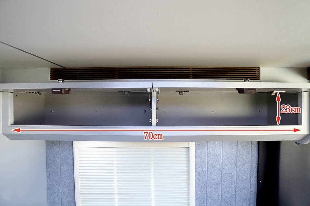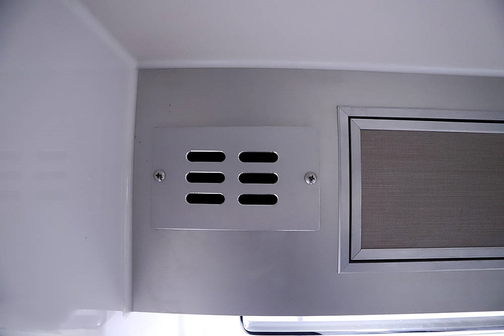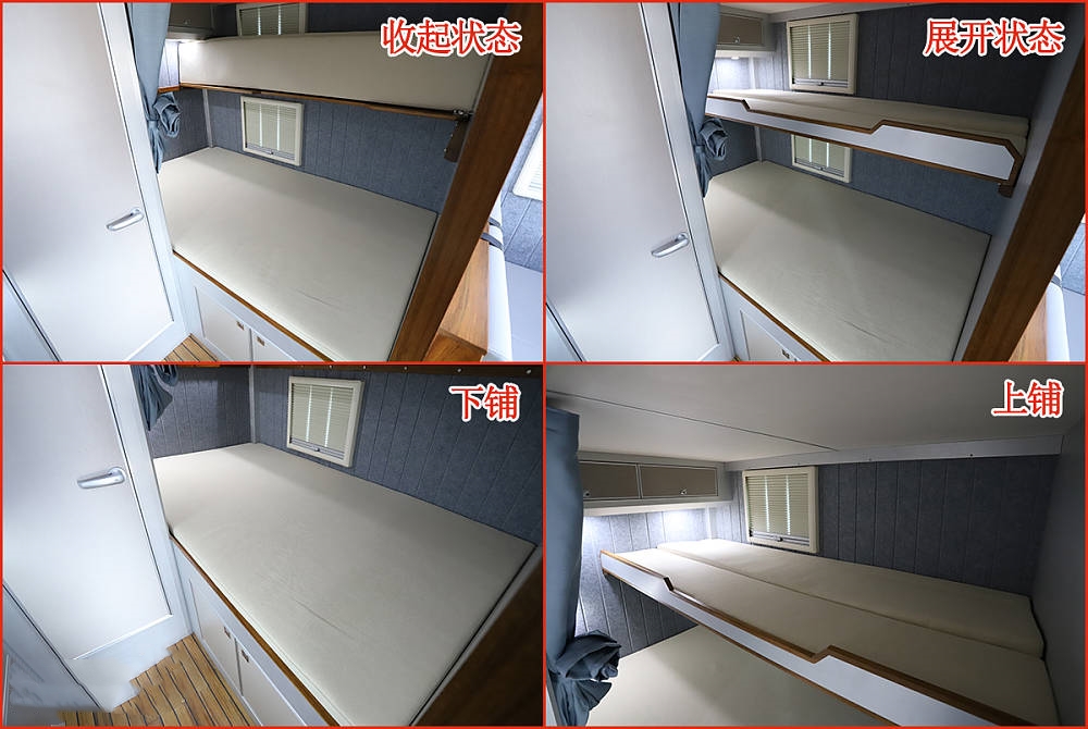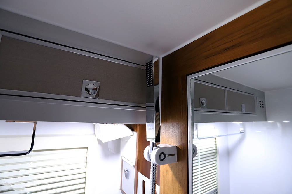后部一角則是睡臥區域,采用縱置子母床設計,滿足3名成年人休息;上鋪收放自如,日常利于擴展下鋪活動空間。上鋪尺寸為197×76(cm),離頂部51cm;下鋪197×112(cm),離上鋪高60cm。床板下方單獨設計有電路檢修倉,利于后期日常維護。生活區后部單獨設有多美達頂置駐車冷暖空調,對于該配置相信了解房車的用戶也習以為常了。