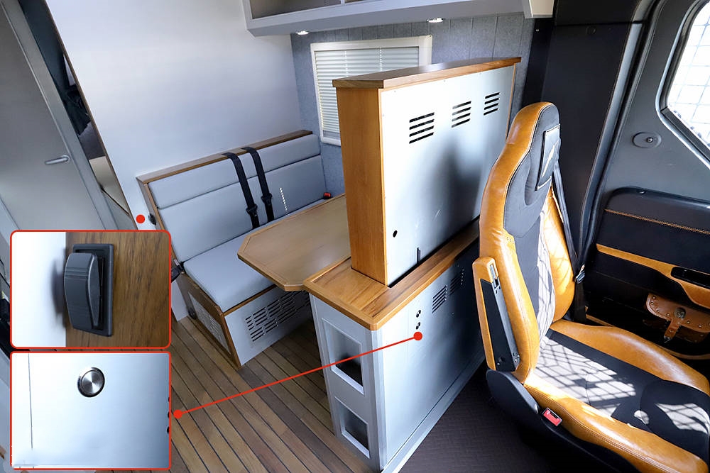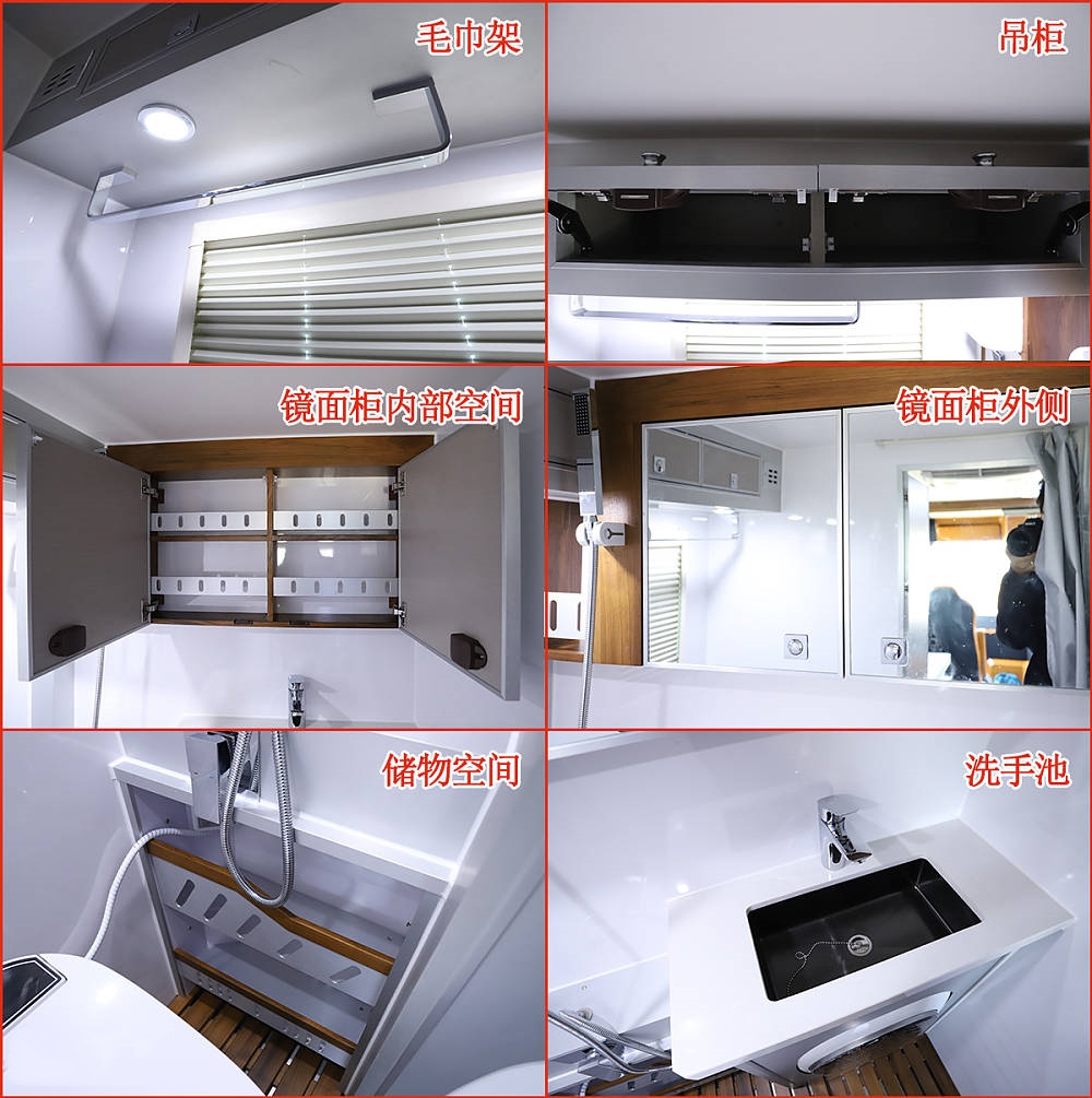 廚房區域包括儲物架、吊柜、莫博牌吸油煙機、西門子單眼電磁爐/不銹鋼水槽+水龍頭、英得爾76L冰箱及松下微烤一體機。功能相對集中體現出距離短高效的作業方式。其它生活配置包括全自動水泵、水路系統、2臺4WK偉巴斯特暖風機、多美達Harrier Plus頂置駐車空調、9KW偉巴斯特即熱式熱水器及原車360°監控系統。
