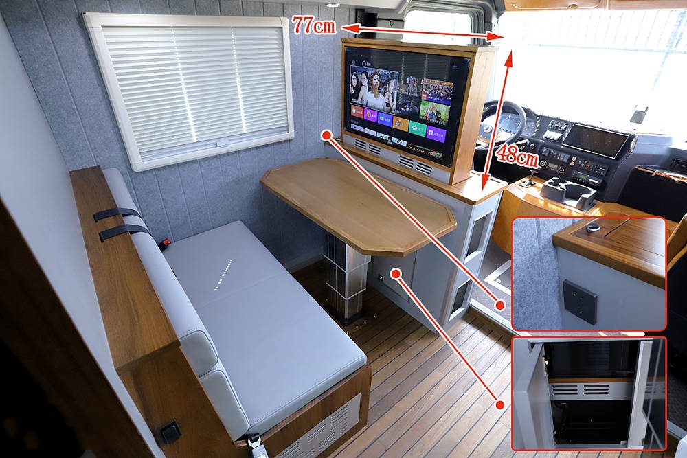 會客區周圍設計有充電插孔及充電接口,利于日常辦公、娛樂、飲食等需求。值得一提,影音娛樂系統方面,會客區周圍配備有32寸液晶升降電視+日本品牌音響。液晶升降電視含邊框尺寸為77×48(cm)。升降桌控制開關位于卡座靠背外側,升降電視控制開關則位于背面兩個獨立圓形按鈕。此外,電視柜下方留有維修口,便于日常維護。側面設計了內凹式的收納空間,便于放些小件物品。