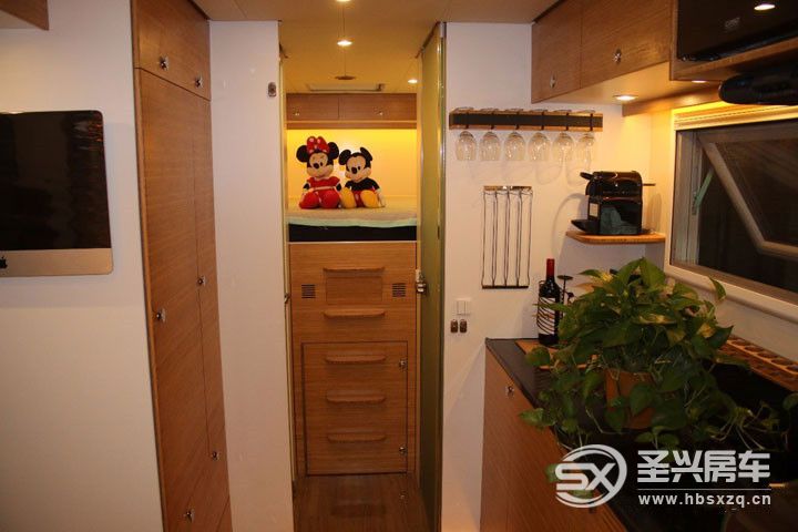 車廂內(nèi)部不僅提供了所有居家設(shè)施,而且還有周密的多功能設(shè)計(jì),為您提供一個(gè)溫馨而誘人的空間使您的旅途更加愉快。主要配有固定尺寸的舒適雙人床、一6個(gè)人的U形沙發(fā)(可轉(zhuǎn)換為一張雙人床)、設(shè)備齊全的廚房、一個(gè)寬敞的臺(tái)面與集成的電磁爐。盥洗室和浴室分開,90度的時(shí)候淋浴房門可以分隔間生活和睡眠功能區(qū)。位于床下還安置有一臺(tái)滾筒洗衣機(jī)。