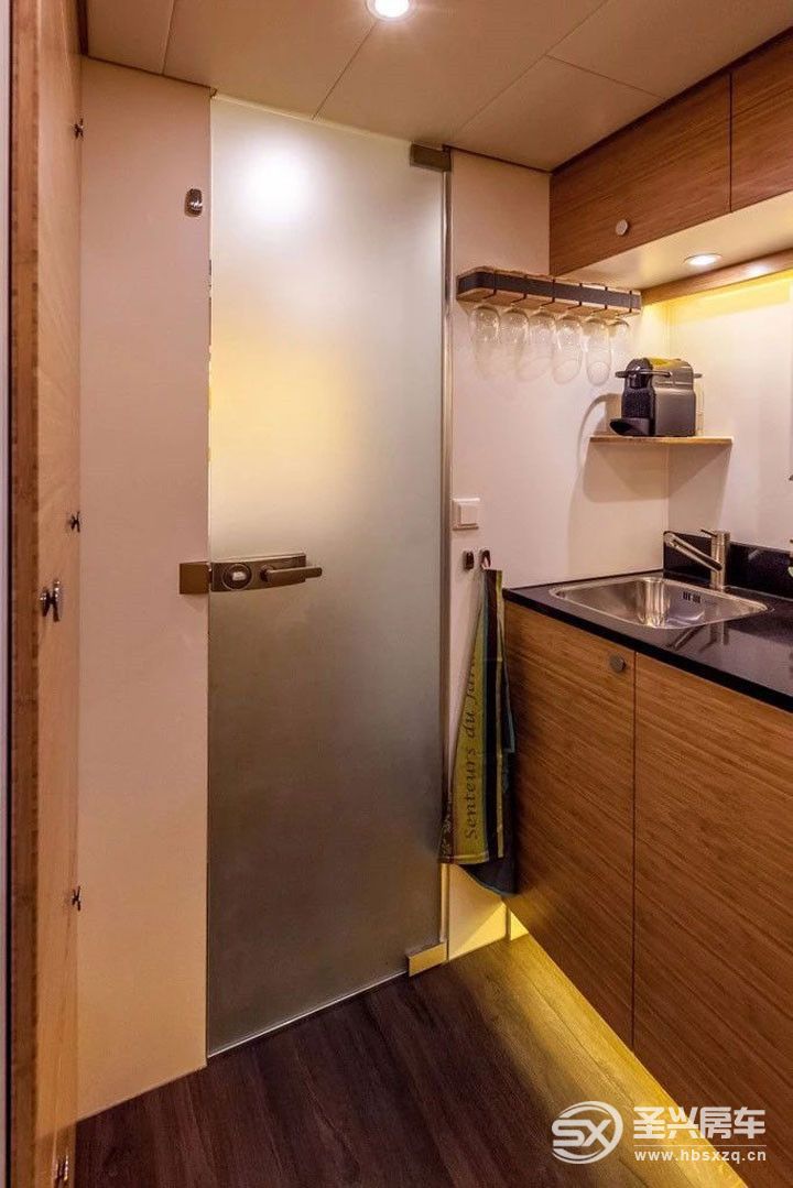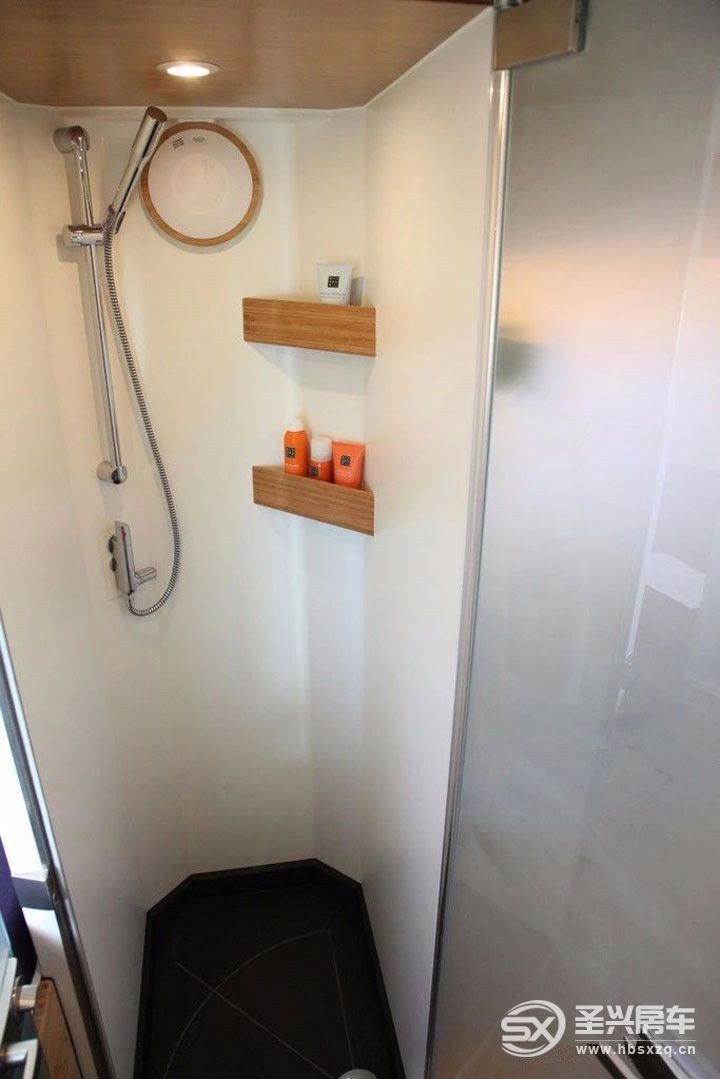 由于車輛裝備了565升的水罐,因此將不會(huì)出現(xiàn)清潔用水供應(yīng)不足的情況。浴室與廁所均安裝了10mm厚度的鋼化玻璃門,凸顯豪華裝飾。在標(biāo)準(zhǔn)配置車型中,浴室門擁有兩種關(guān)閉位置。當(dāng)以90度位置關(guān)門時(shí),通過(guò)將(浴室與廁所之間的)通道臨時(shí)轉(zhuǎn)換為浴室空間,實(shí)際上形成了一個(gè)更衣室。這樣,可以增加浴室空間,避免浪費(fèi)寶貴的內(nèi)部空間。