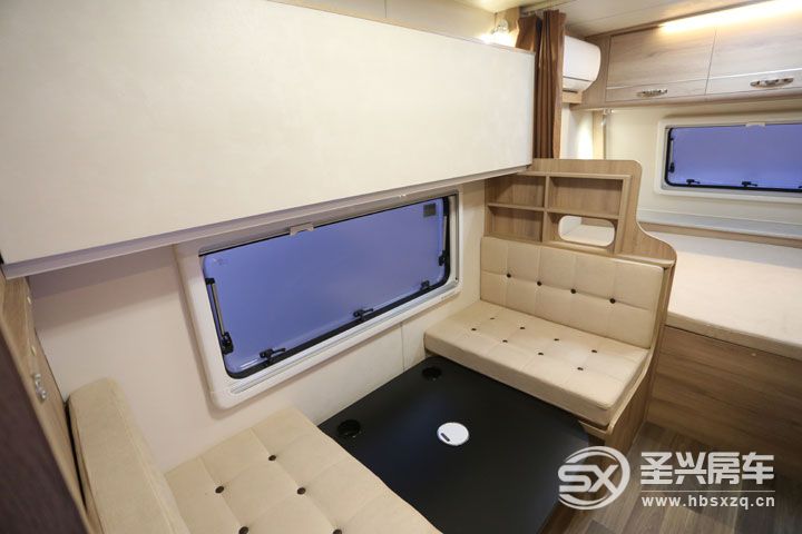 新車有著寬敞舒適的大客廳,設計有雙人對坐式的卡座沙發,中間配置有一張升降式餐桌,餐桌降下之后能拼成一張2000*1000mm單人床,內側是一扇長度近1米的外推窗,坐在這里看風景便可盡收眼底。值得一提的是愛旅490全系車窗均采用雙層隔熱保溫防紫外線隱私車窗,并且車窗與箱體貼合也十分緊密,風阻系數小??ㄗ喜渴且粡埛凼缴箱?,床板可掀起固定不會影響下部卡座區的使用。