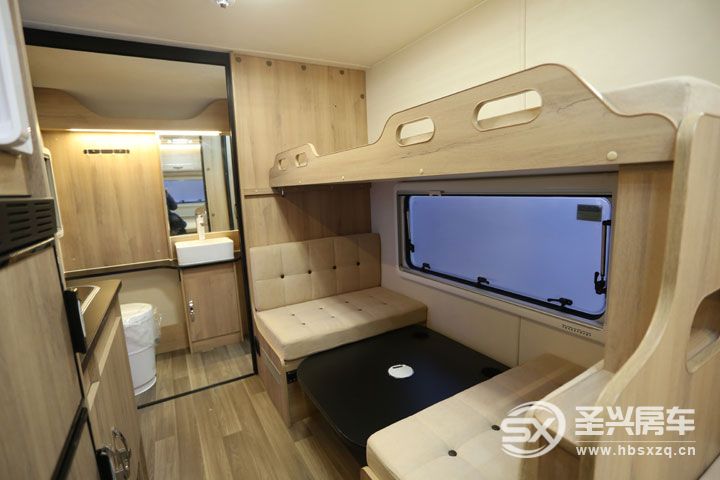 后部的設計是該車的亮點所在!干濕分離的大衛浴間,外部是防水推拉門。配置有進口電動馬桶、陶瓷洗臉盆、外推窗、儲物格、毛巾架、儲物柜、化妝鏡,內部的獨立淋浴間則配置了淋浴花灑、12V雙向換氣扇。